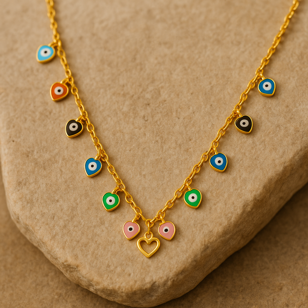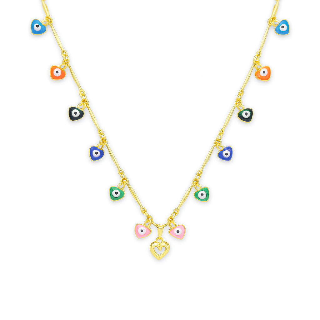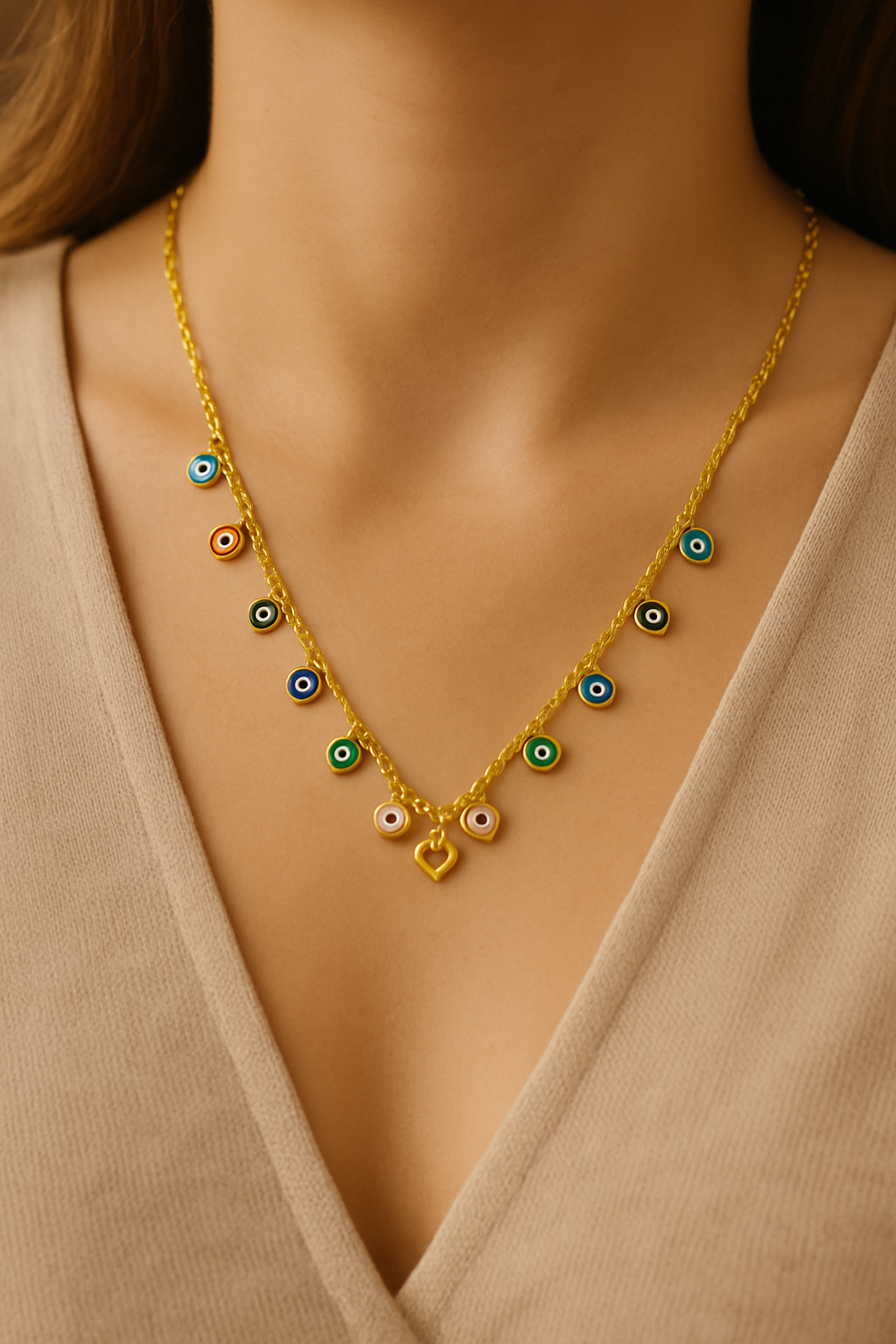 Embrace both style and protection with our stunning Colorful Evil Eye Necklace. This beautiful accessory features a vibrant array of colors, making it the perfect statement piece for any outfit. The evil eye symbol, believed to ward off negative energy and bring good fortune, is elegantly adorned with sparkling beads in shades of blue, red, yellow, and green. Whether you're looking to add a unique touch to your jewellery collection or seeking a thoughtful gift, this Colorful Evil Eye Necklace offers a blend of fashion and spiritual protection. Crafted with high-quality materials, it’s designed to be durable and comfortable for daily wear.