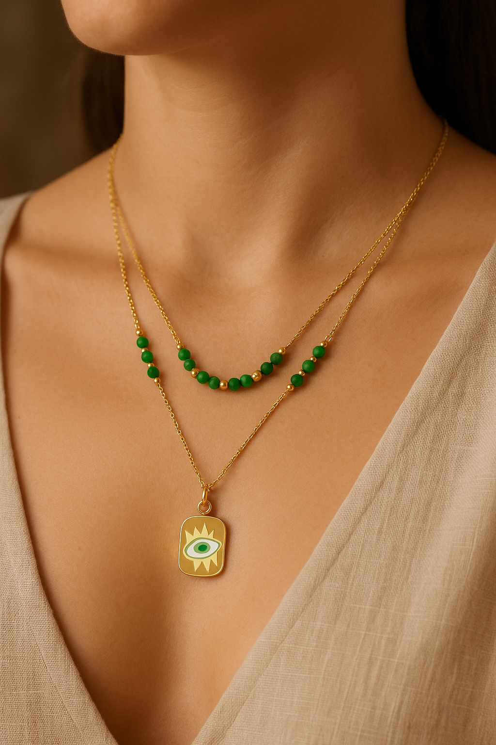 Discover the perfect blend of style and symbolism with our Enchanting Eye Necklace. This stunning piece features an intricately designed eye pendant, known for its protective properties across various cultures. Crafted from high-quality materials, the necklace combines elegance with spiritual significance, making it a meaningful addition to any jewelry collection. The Enchanting Eye Necklace is perfect for those seeking both beauty and protection. The eye symbol is believed to ward off negative energy and bring good luck, making it an ideal gift for loved ones or a personal talisman. Whether worn daily or for special occasions, this necklace adds a touch of mystical charm and sophistication.