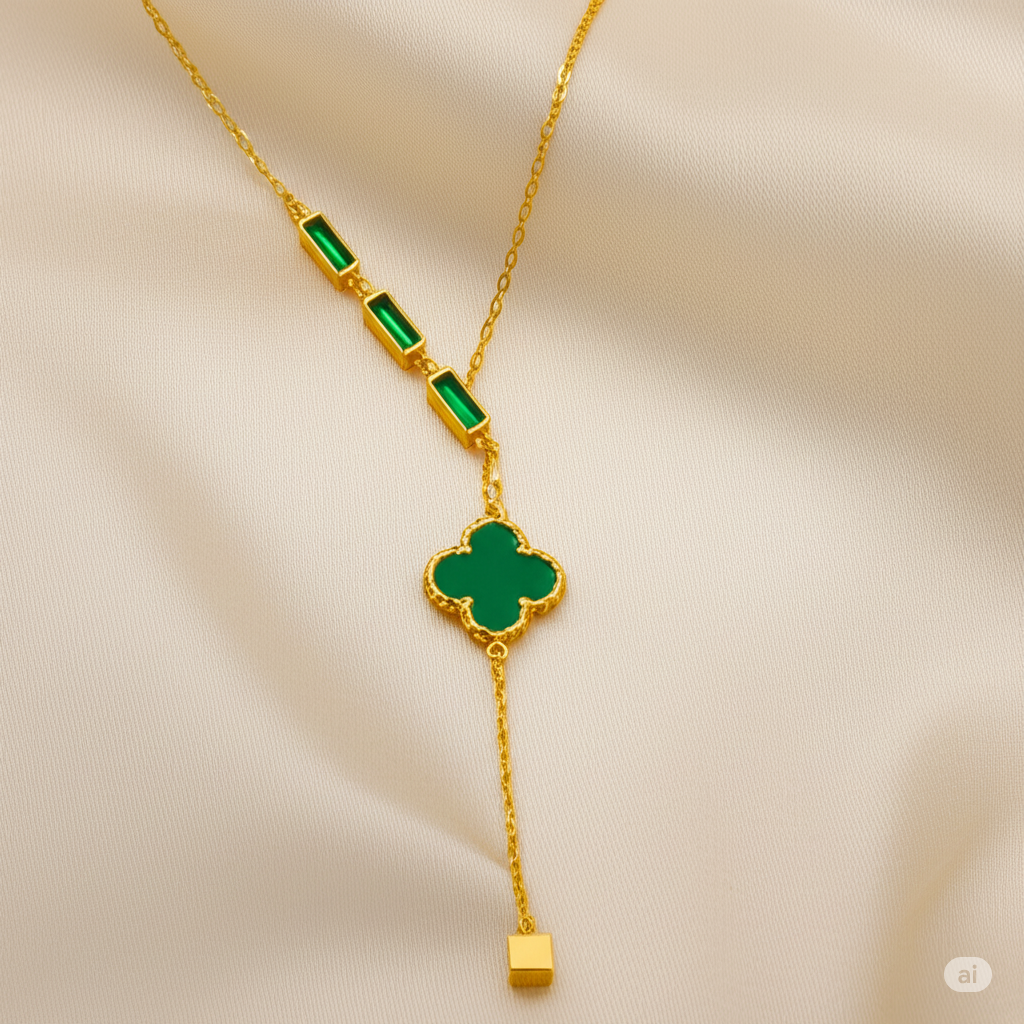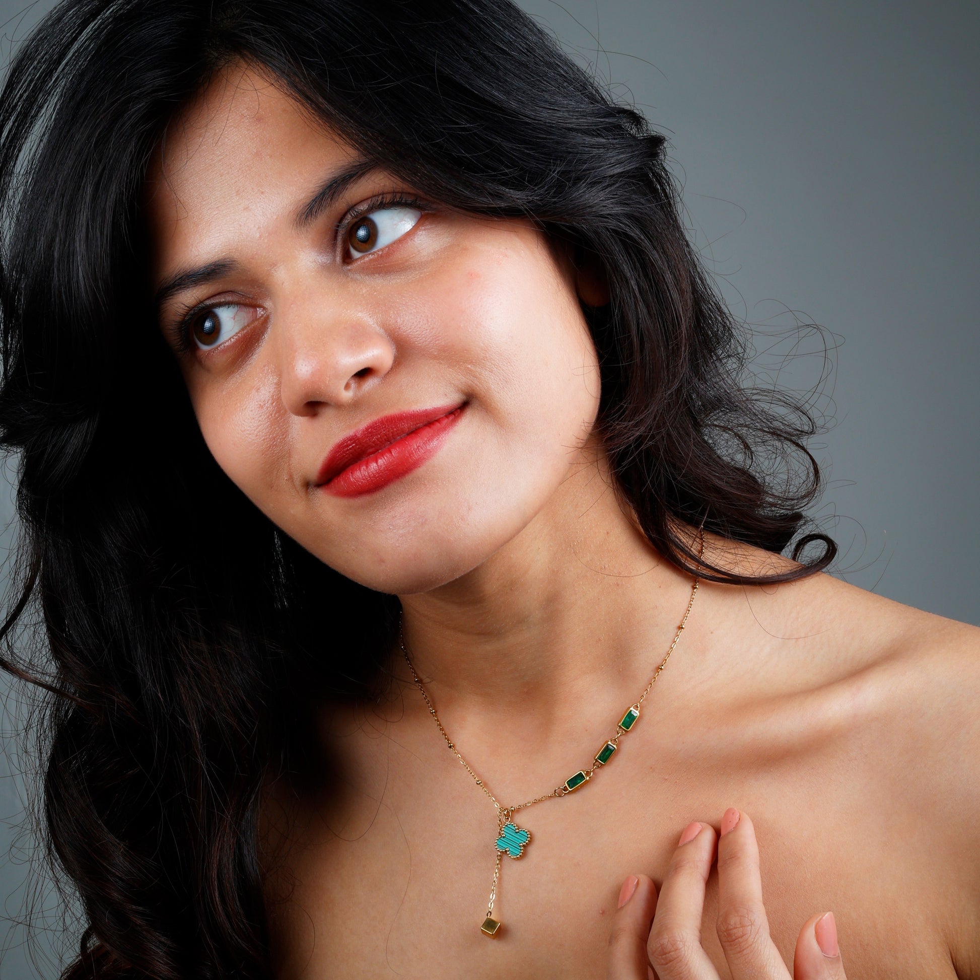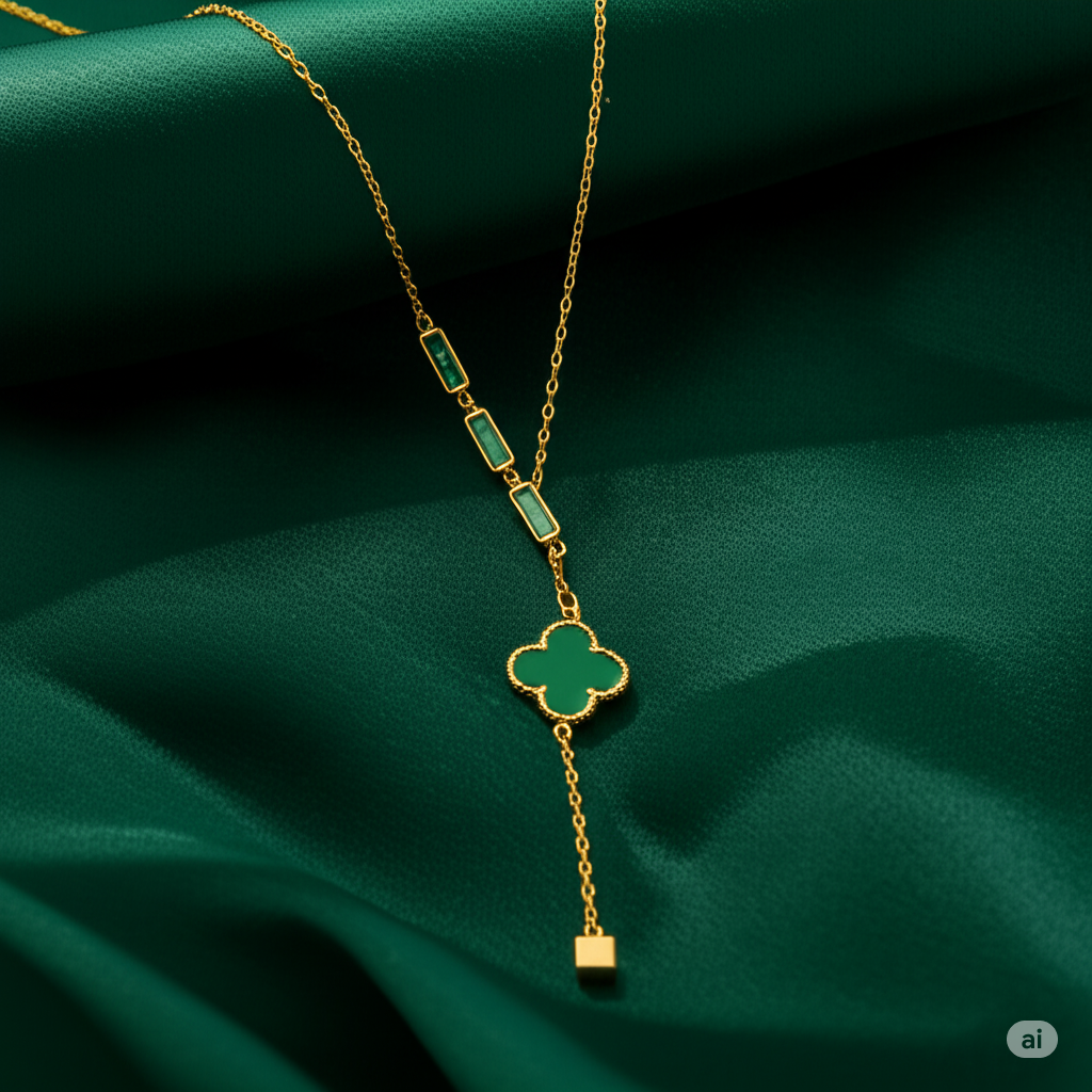 Discover the charm of our Green Clover Necklace, a symbol of good luck and positive energy. Crafted with precision, this delicate necklace features a vibrant green clover pendant, perfect for adding a touch of nature-inspired elegance to any outfit. Whether you're looking for a meaningful gift or a stylish accessory, this lucky clover necklace is sure to make a statement. Made with high-quality materials, the Green Clover Necklace offers both durability and timeless beauty. Its adjustable chain ensures a perfect fit for all. Ideal for everyday wear or special occasions, this necklace is a must-have addition to your jewellery collection.