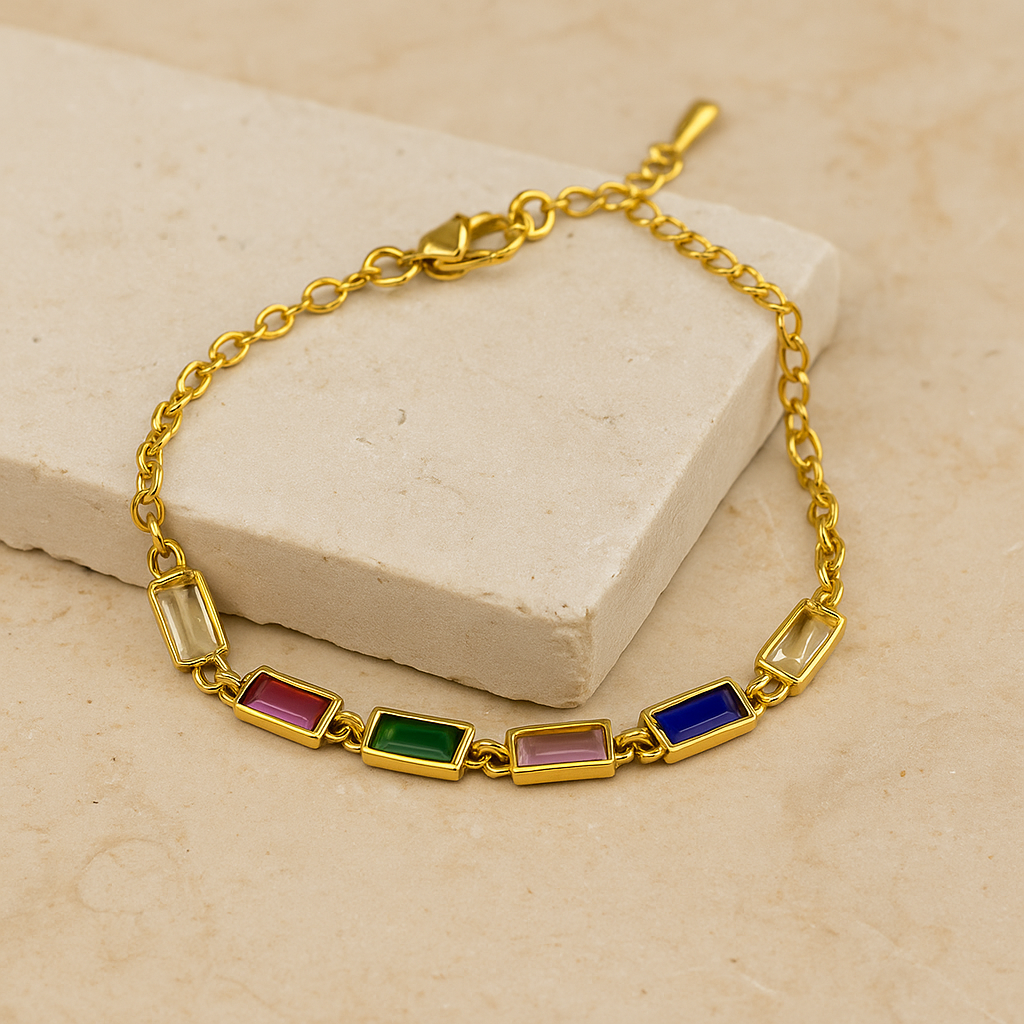 Add a pop of color and sophistication to your jewelry collection with our stunning Multi-Colored Stone Bracelet. Crafted with precision, this bracelet features a vibrant mix of carefully selected stones, each offering its unique hue and charm. The combination of rich colors creates an eye-catching piece that complements any outfit, whether casual or formal. Perfect for everyday wear or special occasions, the Multi-Colored Stone Bracelet is designed for both comfort and style. Its versatile design makes it an excellent choice for layering or wearing alone for a bold statement. The bracelet is also a great gift idea for those who appreciate timeless beauty and vibrant energy.